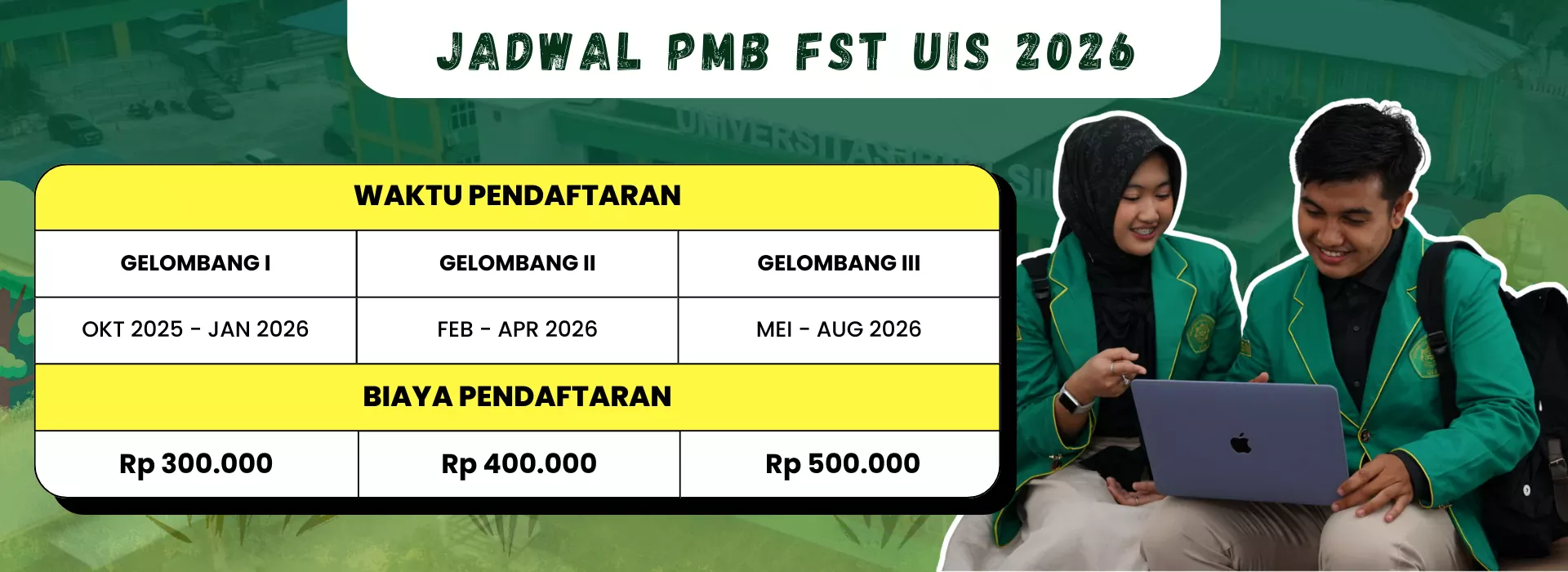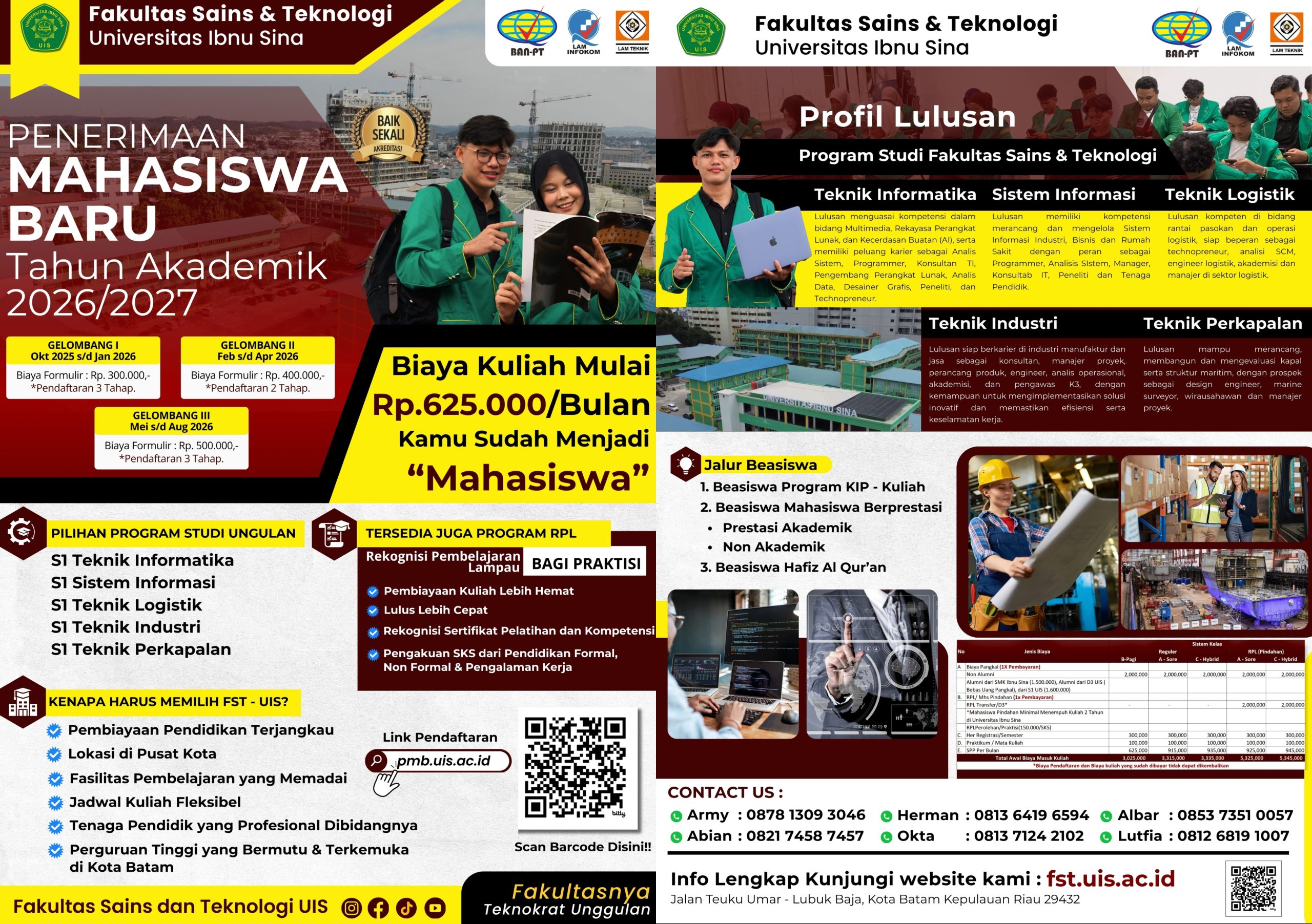 Pendaftaran Mahasiswa Baru Fakultas Sains dan Teknologi Universitas Ibnu Sina, telah dibuka. Terdapat 5 Jurusan unggulan, yaitu:
